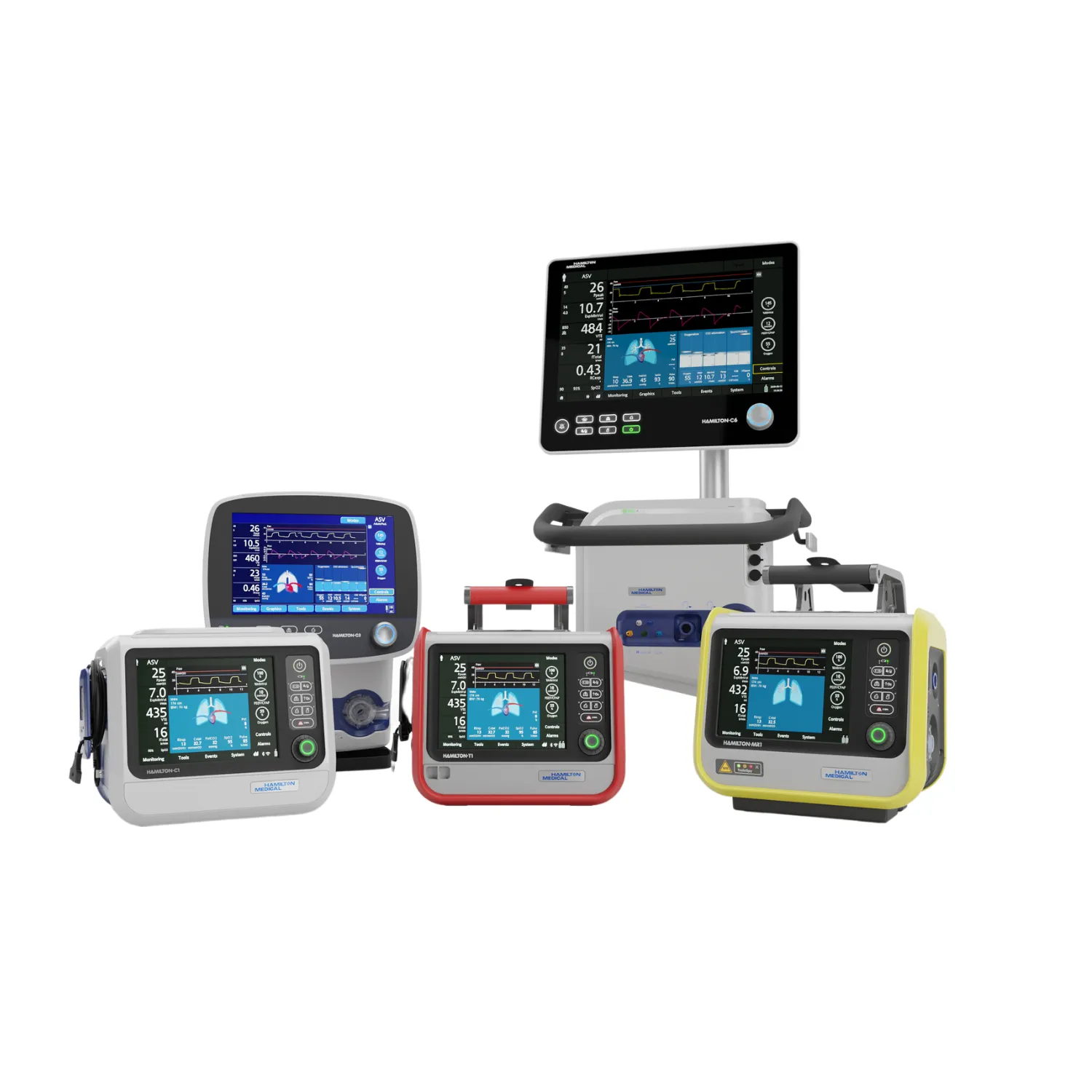 Find the right ventilator to suit your clinical care setting. Our devices offer advanced features to care for even the most complex patients, and different levels of mobility for use on the go or where space is limited. Whether it is in the ICU, in the MRI suite, or during transport, the user interface of all Hamilton Medical ventilators works in the same way. Our Ventilation Cockpit integrates complex data into intuitive visualizations.